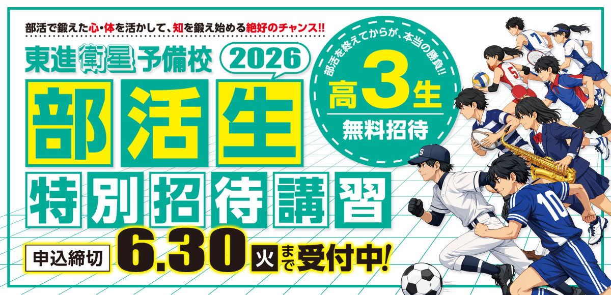 26/04/21 2026年「高3部活生特別招待講習」のご案内 ホーム » 2026年「高3部活生特別招待講習」のご案内 ページメニュー アーカイブ アーカイブ 月を選択 2026年4月 2026年3月 2026年2月 2026年1月 2025年12月 2025年11月 2025年10月 2025年9月 2025年8月 2025年7月 2025年6月 2025年5月 2025年4月 2025年3月 2025年2月 2025年1月 2024年12月 2024年11月 2024年10月 2024年9月 2024年8月 2024年6月 2024年5月 2023年12月 2023年10月 2023年9月 2023年8月 2023年7月 2023年6月 2023年5月 2023年4月 2023年3月 2023年2月 2023年1月 2022年12月 2022年11月 2022年10月 2022年9月 2022年8月 2022年7月 2022年6月 2022年5月 2022年4月 2022年3月 2022年2月 2022年1月 2021年12月 2021年11月 2021年10月 2021年9月 2021年8月 2021年7月 2021年6月 2021年5月 2021年4月 2021年3月 2021年2月 2021年1月 2020年12月 2020年11月 2020年10月 2020年9月 2020年8月 2020年7月 2020年6月 2020年5月 2020年4月 2020年3月 2020年2月 2020年1月 2019年12月 2019年11月 2019年10月 2019年9月 2019年8月 2019年7月 2019年6月 2019年5月 2019年4月 2019年3月 2019年2月 2019年1月 2018年12月 2018年11月 2018年10月 2018年9月 2018年8月 2018年7月 2018年6月 2018年5月 2018年4月 2018年3月 2018年2月 2018年1月 2017年12月 2017年11月 2017年10月 2017年8月 2017年7月 2017年6月 2017年5月 2017年4月 2017年3月 2017年2月 2017年1月 2016年12月 2016年11月 2016年10月 2016年9月 2016年8月 2016年7月 2016年6月 2016年5月 2016年4月 2016年3月 2016年2月 2016年1月 2026年「高3部活生特別招待講習」のご案内 部活も勉強も一生懸命な高3生のキミを 東進の講座に1講座無料でご招待! 対象 部活に一生懸命取り組んできた高3生 (東進生でない方) 申込締切 6月30日(火)まで 受講期間 7月15日(水)まで 受講料 1講座無料招待 対象講座 対象講座一覧はココをクリック! 申込方法 [総合受付]TEL.088・625・5981 または、下記よりお申し込みください。 ➡お申込みはココをクリック! ※校舎は「東進衛星予備校 徳島南昭和校」または「東進衛星予備校 徳島八百屋町校」を選択してください。 ※高3部活生特別招待講習・夏期特別招待講習・東大対策招待講習は併用できません。 ※高3部活生特別招待講習生は、下記の高速マスター基礎力養成講座での学習が可能です。 ①【英語】共通テスト対応英単語1800、はじめからの基礎単語1200 (ともにスマートフォンアプリ利用可。はじめからの基礎単語1200のアプリ名は「中学英単語1200」) ②【数学】数学計算演習、数学計算演習上級 ③【国語】今日のコラム お電話にて メールフォームへ(24時間受け付けております) 時間割や料金がわかる資料を無料でお送りします。