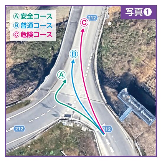 事故が多い箇所なので、一時期警察が取り締まりをやっていた。反則金収入には貢献したかもしれないが、事故はあまり減らなかった。私は何とかしたいと思った。やり方はたくさんあるだろう。信号機の導入も一手である。ただ、導入も維持管理も予算がからむ。私は利用者の一時停止の方法改善がもっとも安上がりで効果的と考えた。停止線前では軽く止まればよい。但し、道に出る時はしっかり停まる。そして、ポイントは停止角度にある。出口の破線に対し90度に車輛を付ける。これで、左右均等な注意確認が可能となる。写真①のⒶ安全コースである。次に問題は他車にどのように示すかである。これは忍耐と時間が要ると覚悟した。私が通るたびに90度付けを励行する。後続車は倣う、その次も倣う。やり始めて、三年目くらいで効果が表れてきた。出方の目撃だけでなく、右へ回る個所に発生する土砂溜まりが左へ左へと移動していった。そして、今七年が経った。効果はあった。「為せば成る」を実感している。