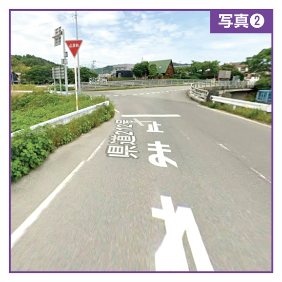 悪いことに、問題は流れだけではない。写真②をみてもらいたい。南から侵入する運転席からの視界である。進路となる右手も橋の欄干(らんかん)が障害となって視界がよくない。元より不注意となりやすい左手からの個通もガードレール、標識、草などが視界を遮っている。さらには、止まれの停止線が手前過ぎて左右の視界も得にくい。停止線から出ていく車線までは9メートルもある。丁寧なドライバーは法律に従い手前の停止線で止まり、次に実質的な確認のために出る道手前で再度停止している。一時停止を二回やっている。